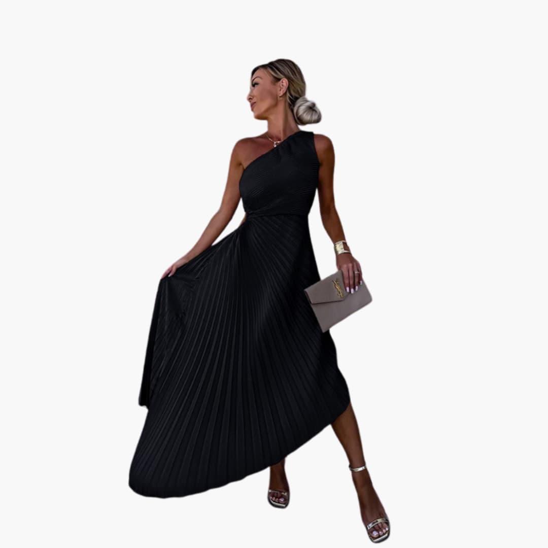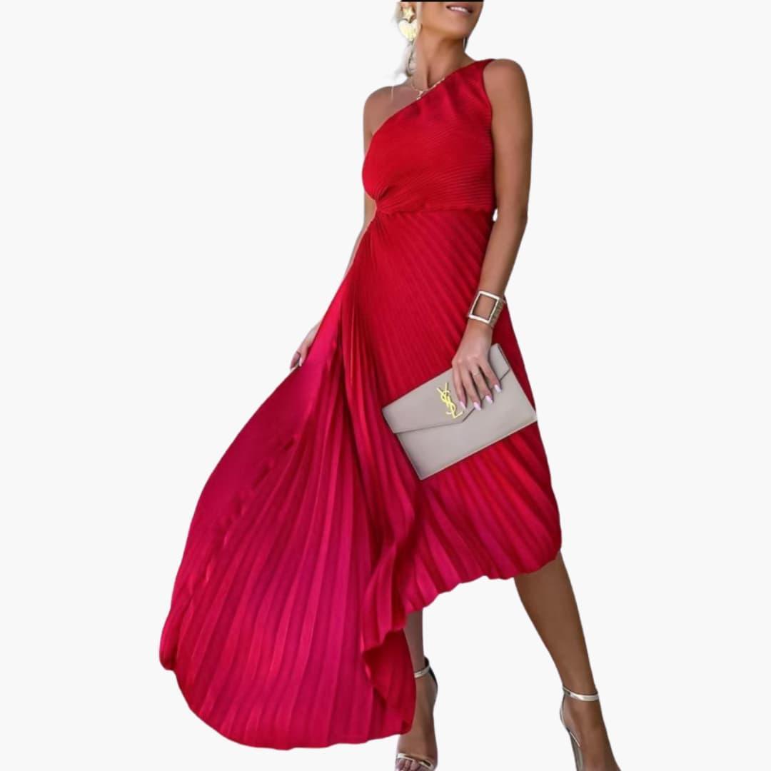 تسحر هذه الفستان المسائي الأنيق بكتفها الواحد وقصتها غير المتناظرة الراقية. إنها تتناسب تمامًا مع المنحنيات لتقديم شكل رائع. قطعة مثالية للتألق خلال أكثر مناسباتك أناقة.