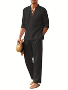 اغمر نفسك في الأناقة غير الرسمية مع هذه المجموعة البوهيمية الأنيقة المكونة من بلوزة ذات أكمام طويلة مزينة بحبل عند العنق وسروال فضفاض بقصة واسعة. مثالية لأيام مشمسة أو الهروب غير الرسمي، تجمع هذه المجموعة بين الأسلوب والراحة. قصتها الخفيفة، جيوبها العملية، وخصرها القابل للتعديل يجعلها خيارًا جماليًا ووظيفيًا.