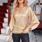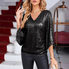 Αυτή η μπλούζα αναδεικνύει τη σιλουέτα με το κομψό V-ντεκολτέ και τα φαρδιά μανίκια που πέφτουν με χάρη. Οι λαμπερές παγιέτες προσθέτουν μια διακριτική γοητεία στην εμφάνισή σας. Ιδανική για βραδιές ή ειδικές περιστάσεις, συνδυάζει κομψό στυλ και απόλυτη άνεση.