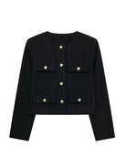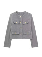Tämä malli yhdistää modernin ja hienostuneen tyylin lyhyellä, rakenteellisella leikkauksella ja huolellisilla yksityiskohdilla. Kultaiset napit ja koristeelliset taskut tuovat ajattoman tyylin, joka on täydellinen korostamaan rentoa tai juhlavaa ilmettä. Täydellinen välikauteen, tämä takki ilmentää eleganttia ja itsevarmaa tyyliä kaikissa tilanteissa.