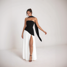 Ez a hosszú ruha kiemeli a sziluettet a strukturált, pánt nélküli fűzőjének köszönhetően. Az oldalsó hasíték nőiességet és magabiztosságot ad. Tökéletes elegáns estékre, ötvözi a bájt és a kényelmet.