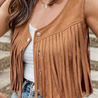 Questa giacca senza maniche presenta frange eleganti e dettagli di bottoni raffinati. Il suo design senza tempo si adatta a varie occasioni. Perfetta per sovrapporre ai tuoi outfit preferiti.