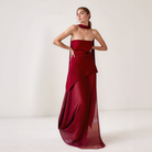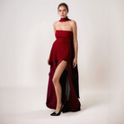 Ta elegancka długa sukienka ma asymetryczny krój z wykończeniem w stylu high-low i nakładką, która dodaje głębi i ruchu. Zintegrowany detal w postaci szala delikatnie owija się wokół szyi lub opada na ramię, tworząc wyrafinowane wykończenie. Wykonana z lekkiego materiału, zapewnia płynny i komfortowy kształt.