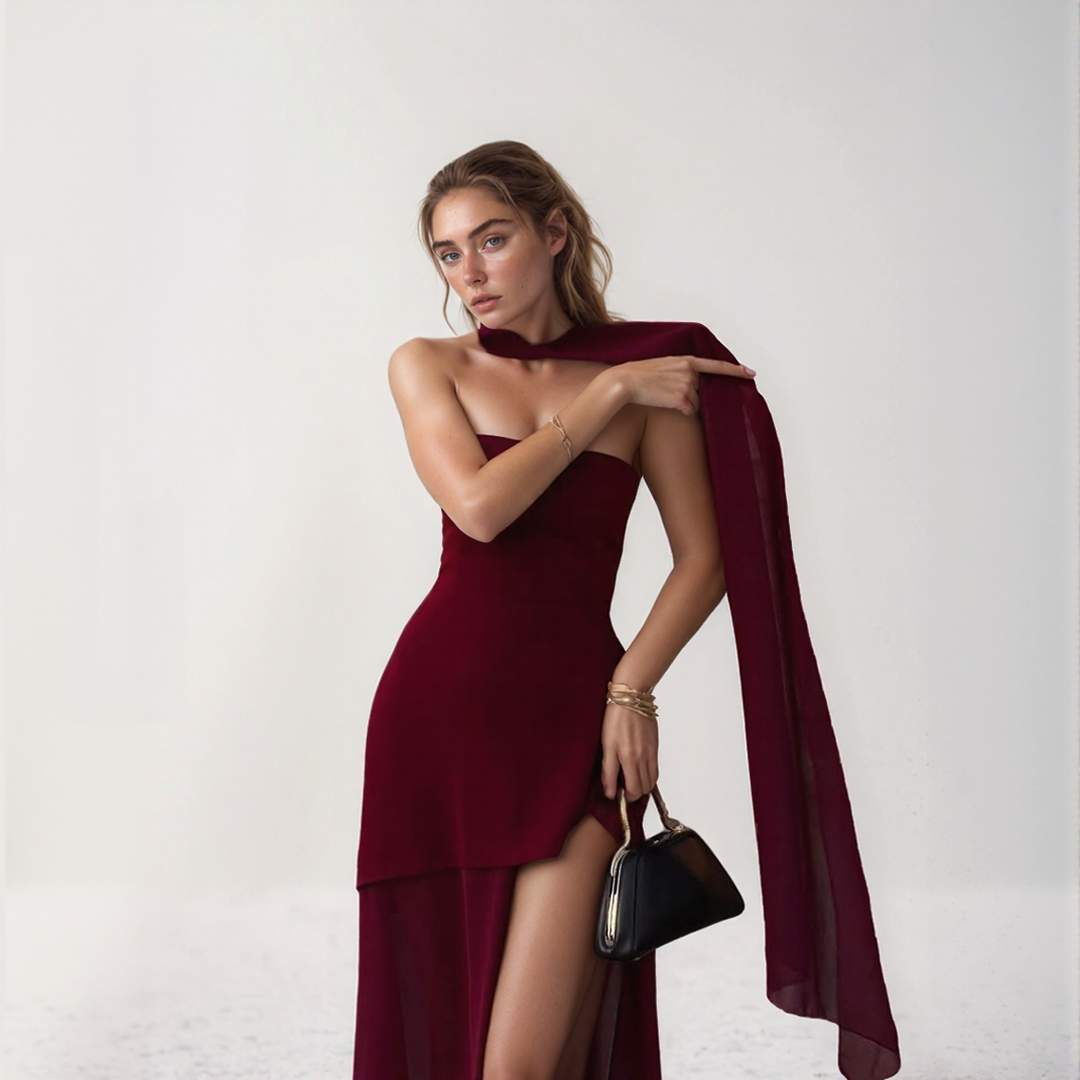 Nelly | Elegancka Długa Sukienka – Asymetryczny Krój i Zintegrowany Szal